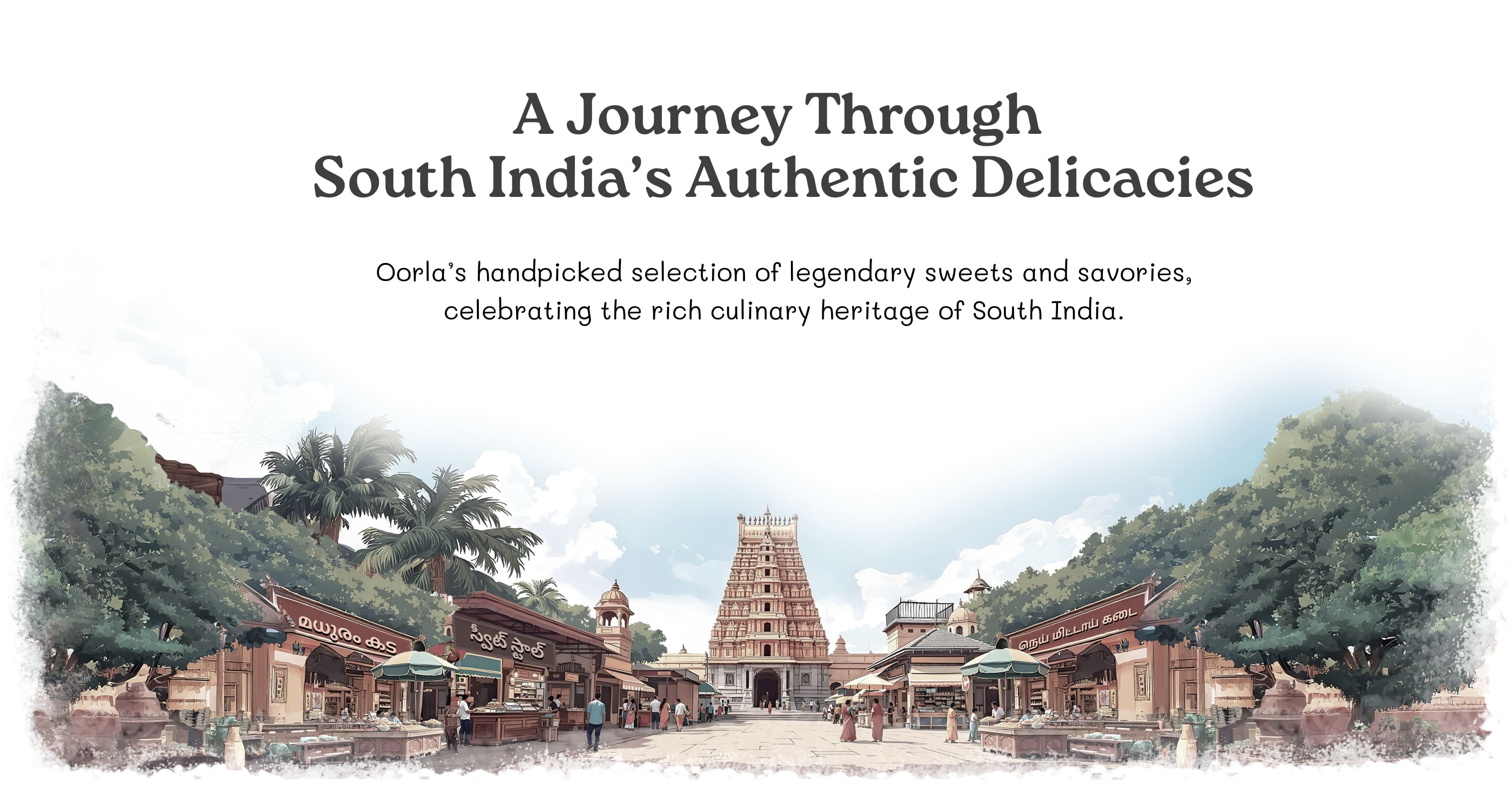 Experience the true taste of the South with Oorla’s South Treats box, a handpicked collection of authentic sweets and snacks from Tamil Nadu, Kerala, Andhra, and Karnataka. Relish Srivilliputhur Palkova, Madurai Mixture, Kerala Nendran Chips, Kozhikode Halwa, Sunnundalu, Murukkulu, Kodubale, and Mysore Pak. A celebration of flavours, traditions, and memories, all in one box.