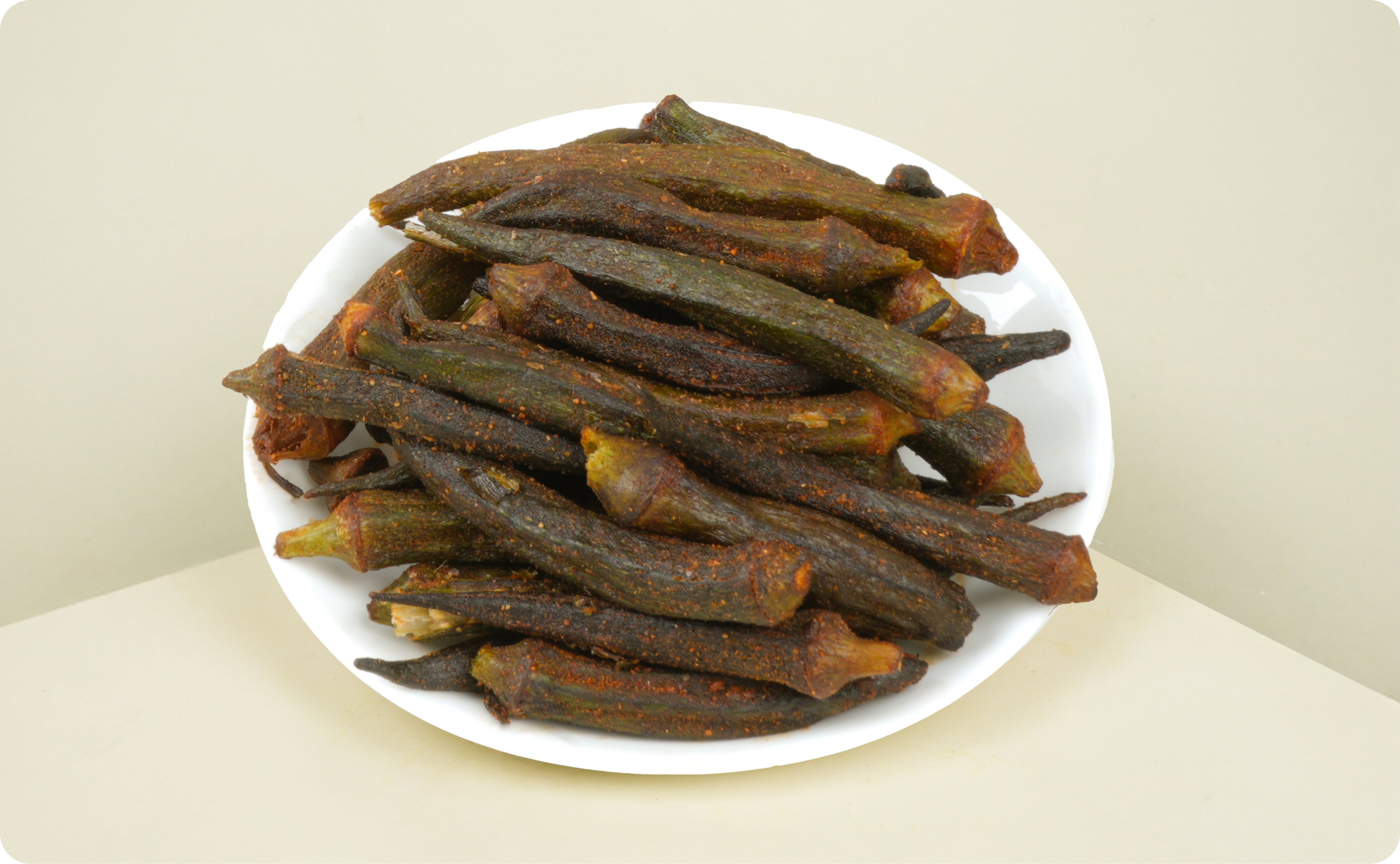 Crispy Bhindi Chips made from fresh okra and lightly seasoned with chilli, jeera, and coriander. Cooked in vegetable palm oil, these crunchy chips are low in fat, zero sugar, and cholesterol-free. A wholesome, flavourful snack for everyday munching.