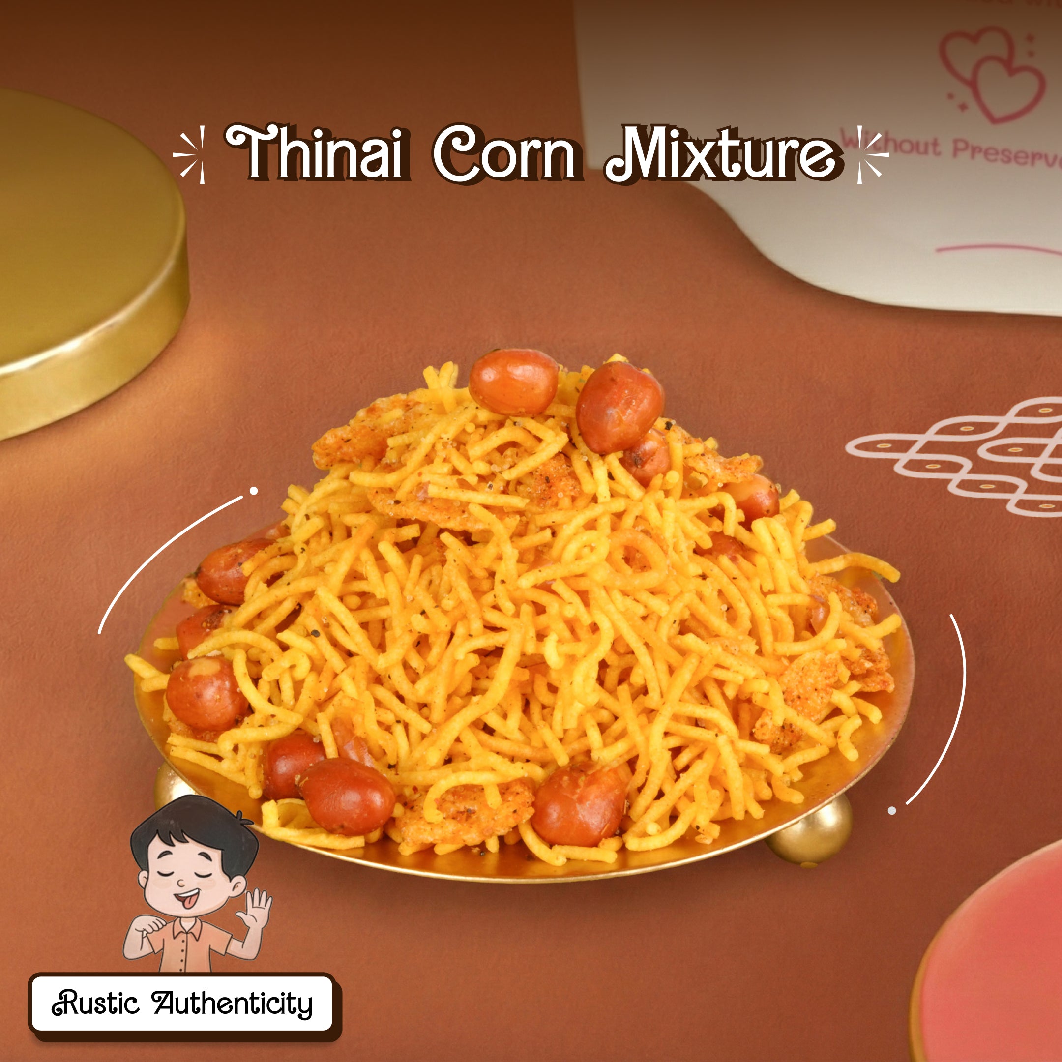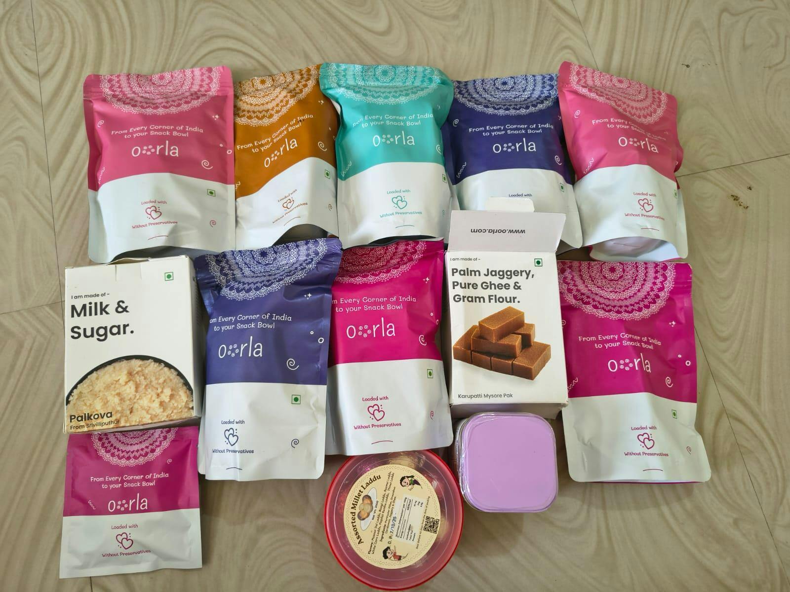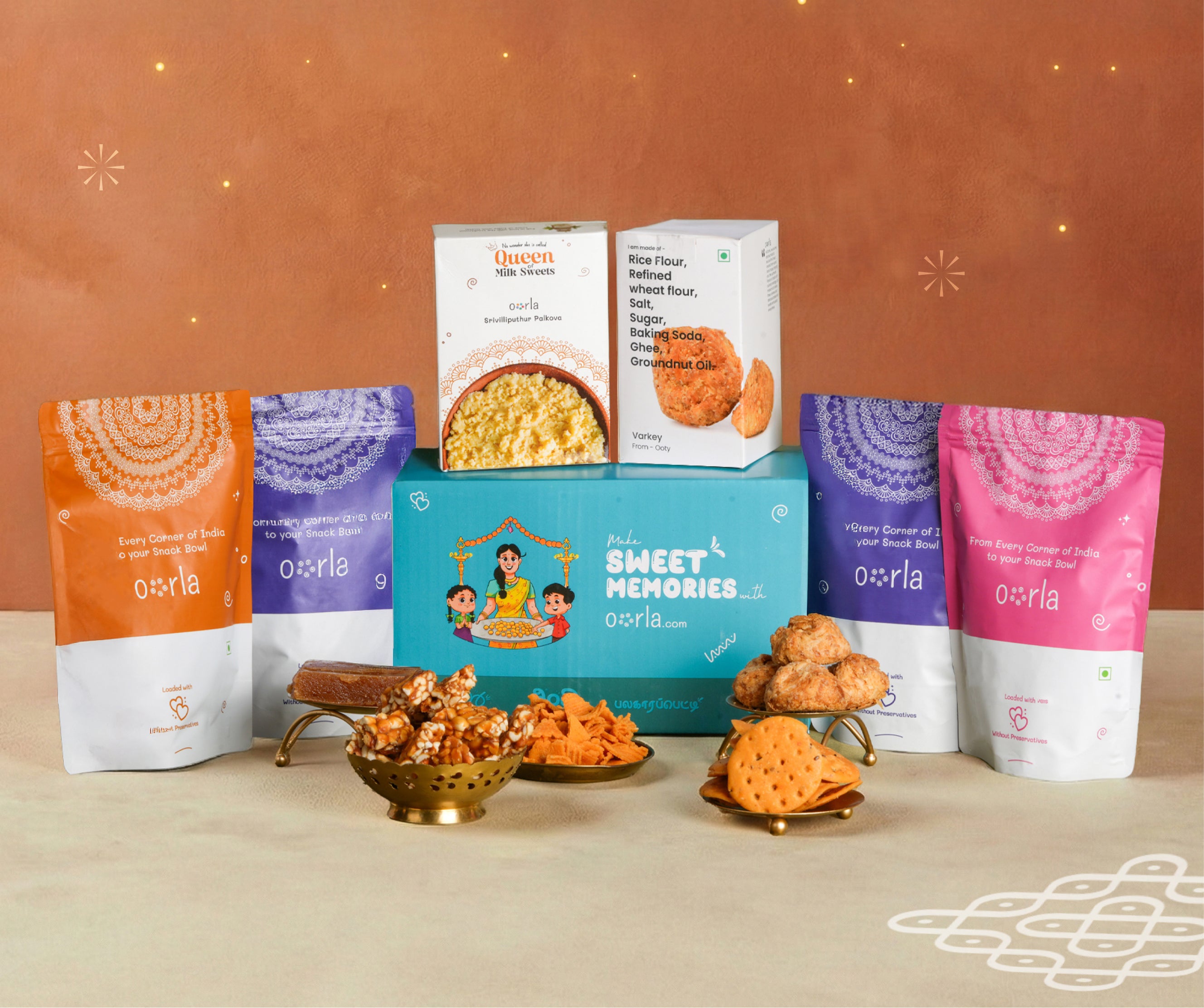 Experience Tamil Nadu’s rich snacking heritage with Oorla’s Navarasa Petti, a grand box of 9 authentic delights. From Srivilliputhur Palkova and Mudalur Muscoth Halwa to Kovilpatti Kadalai Mittai, Ooty Varkey, Thinai Corn Mixture, Karaikudi Kuthiraivali Rings Murukku, Sattur Ribbon Seeval, Trichy Kai Murukku, and Peanut Thattai Murukku, each treat is sourced from its original makers. 100% vegetarian. Shelf life varies by product.