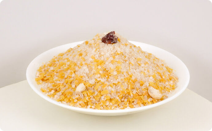 Roasted What Ada, Sugar, Cardamom Powder, Cashew Nuts & Raisins.